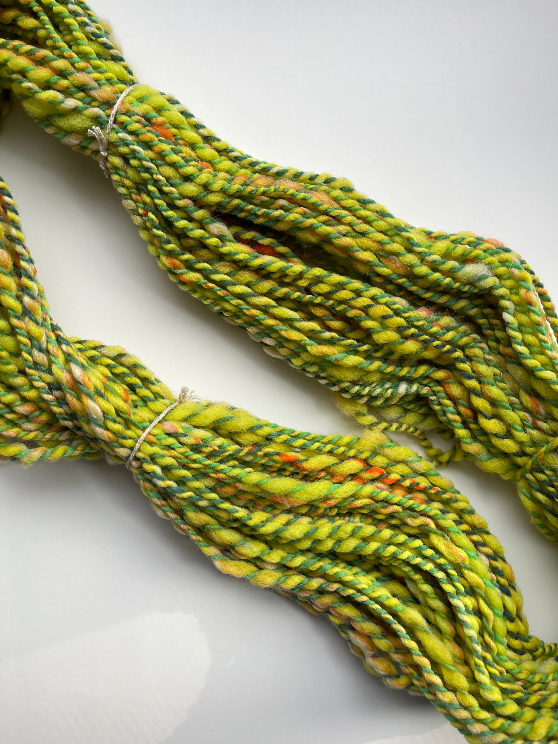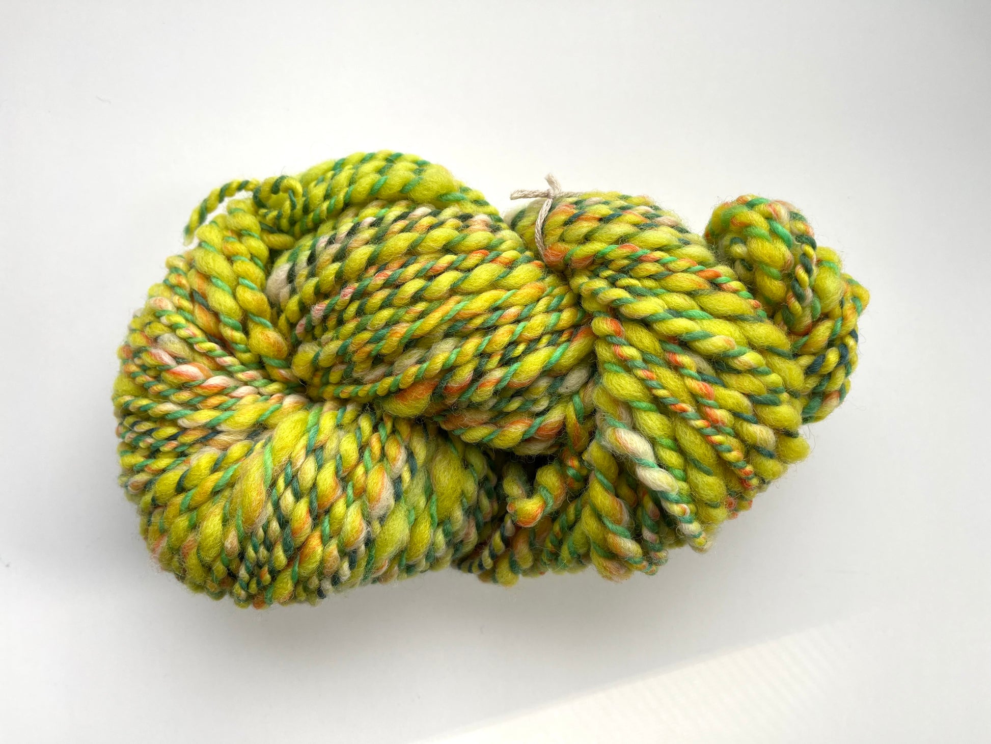 Chartreuse, with bits of orange and cream. Plied with green handspun yarn.