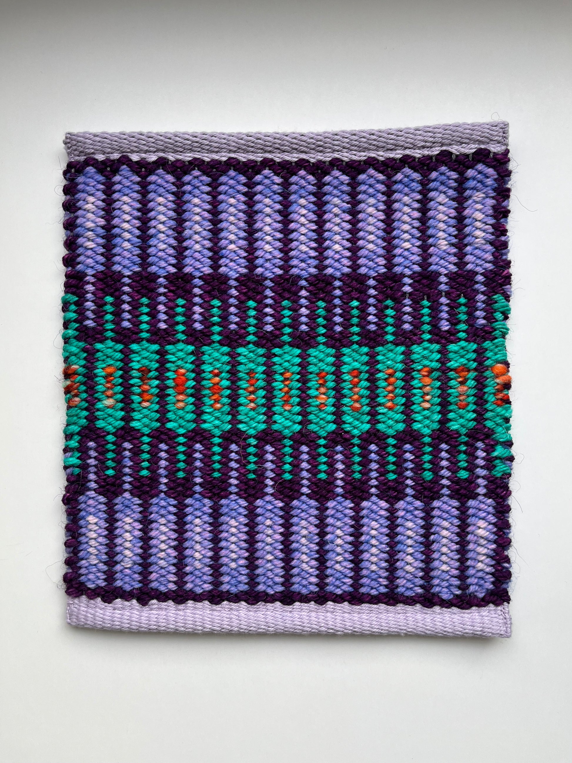 Handwoven and hand-dyed Krokbragd trivet made be me on my floor loom.