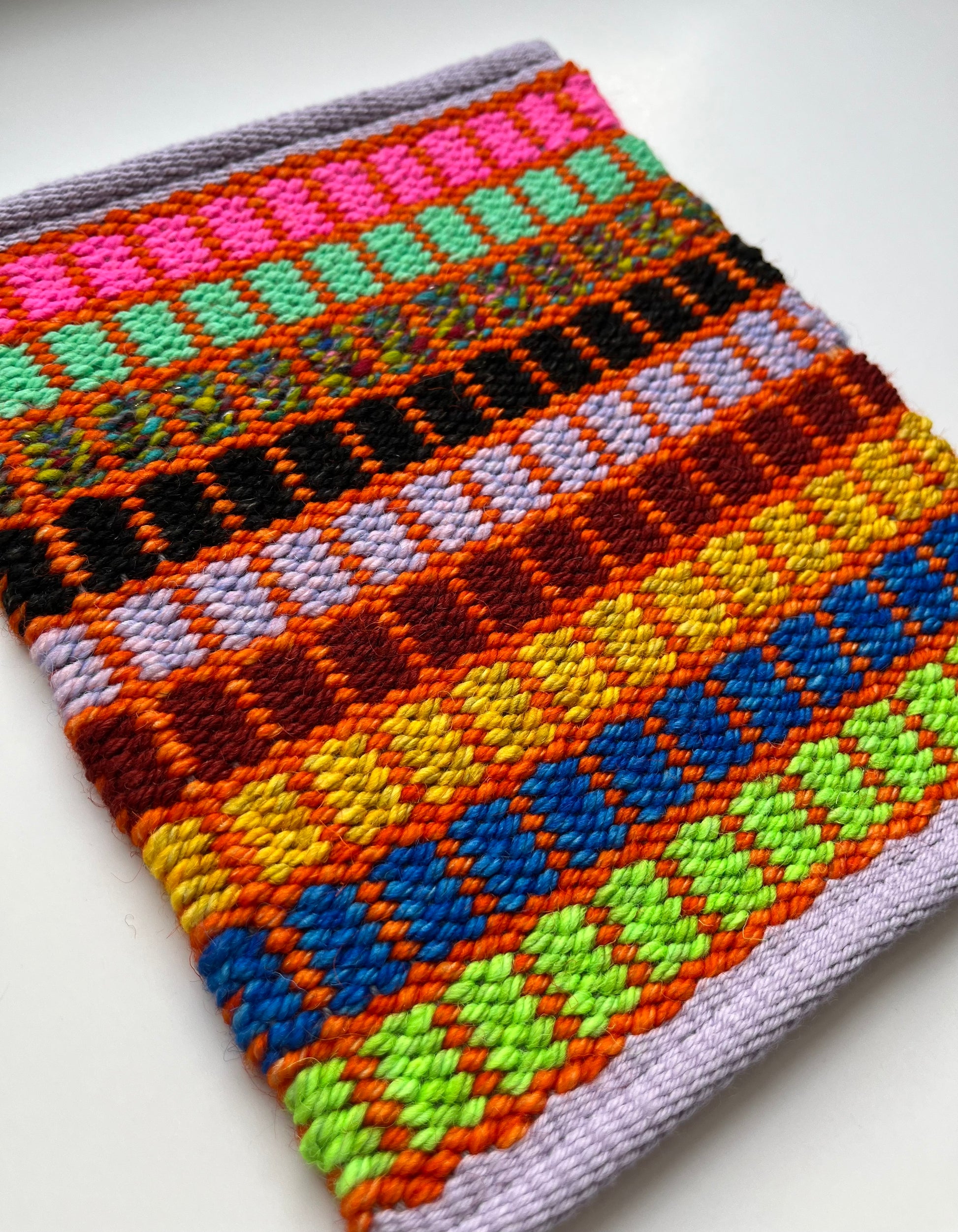 Handwoven and hand-dyed Krokbragd trivet made be me on my floor loom.